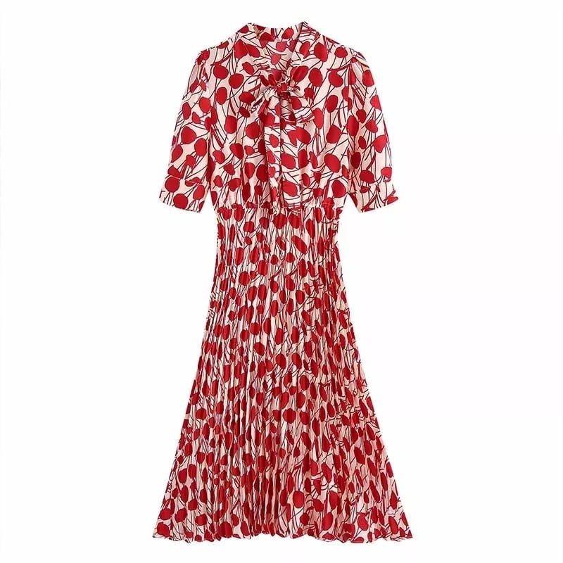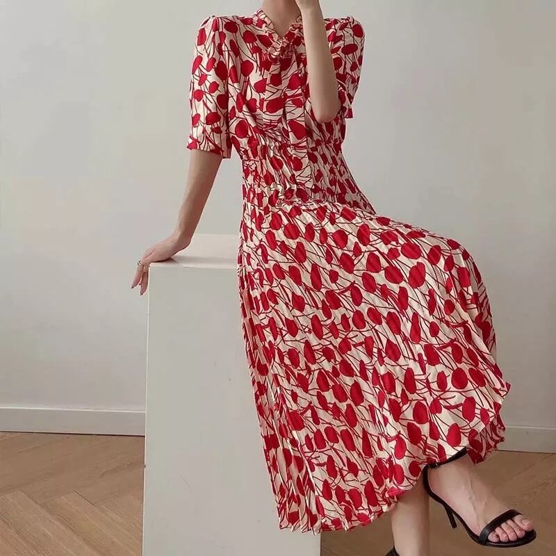 襟リボンプリーツワンピースドレス