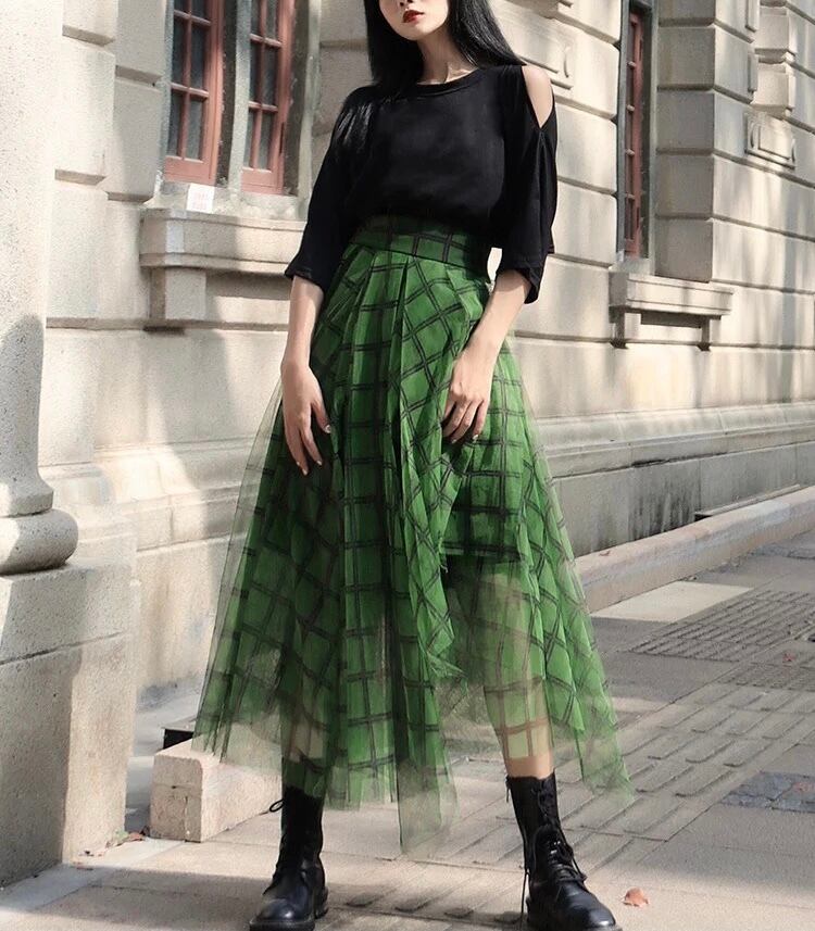 チェック柄チュールスカート